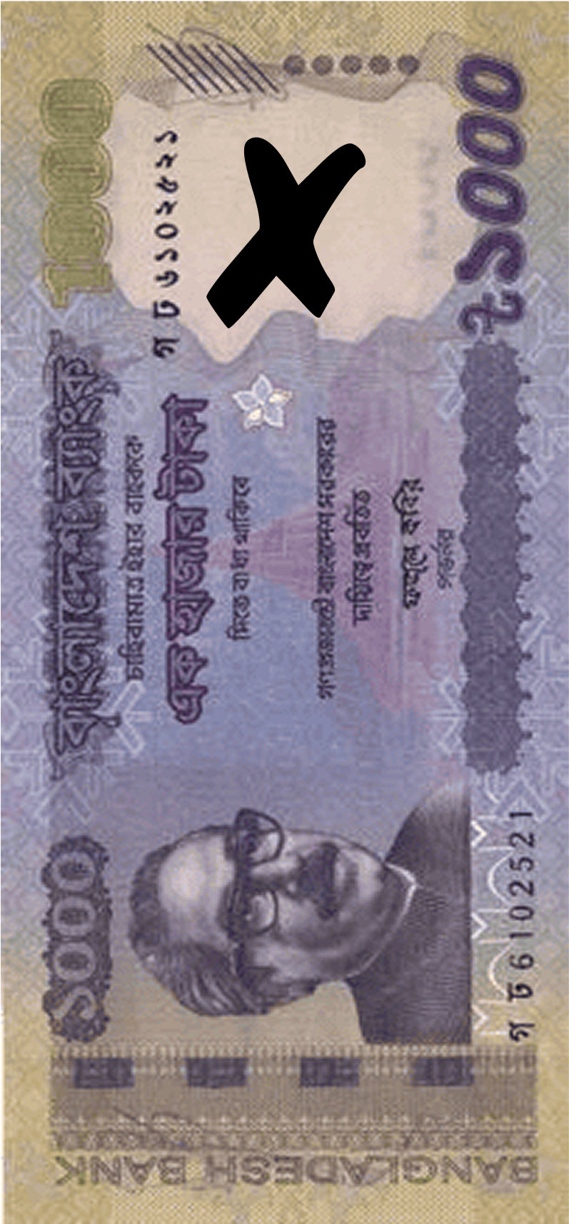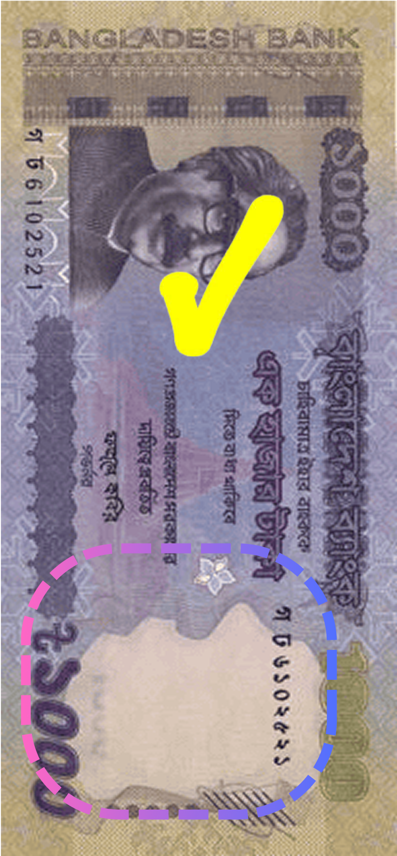 Mark on Taka note to detectgenuine currency paper. Yellowmark indicates genuine Taka note.Dark mark for fake Taka note.